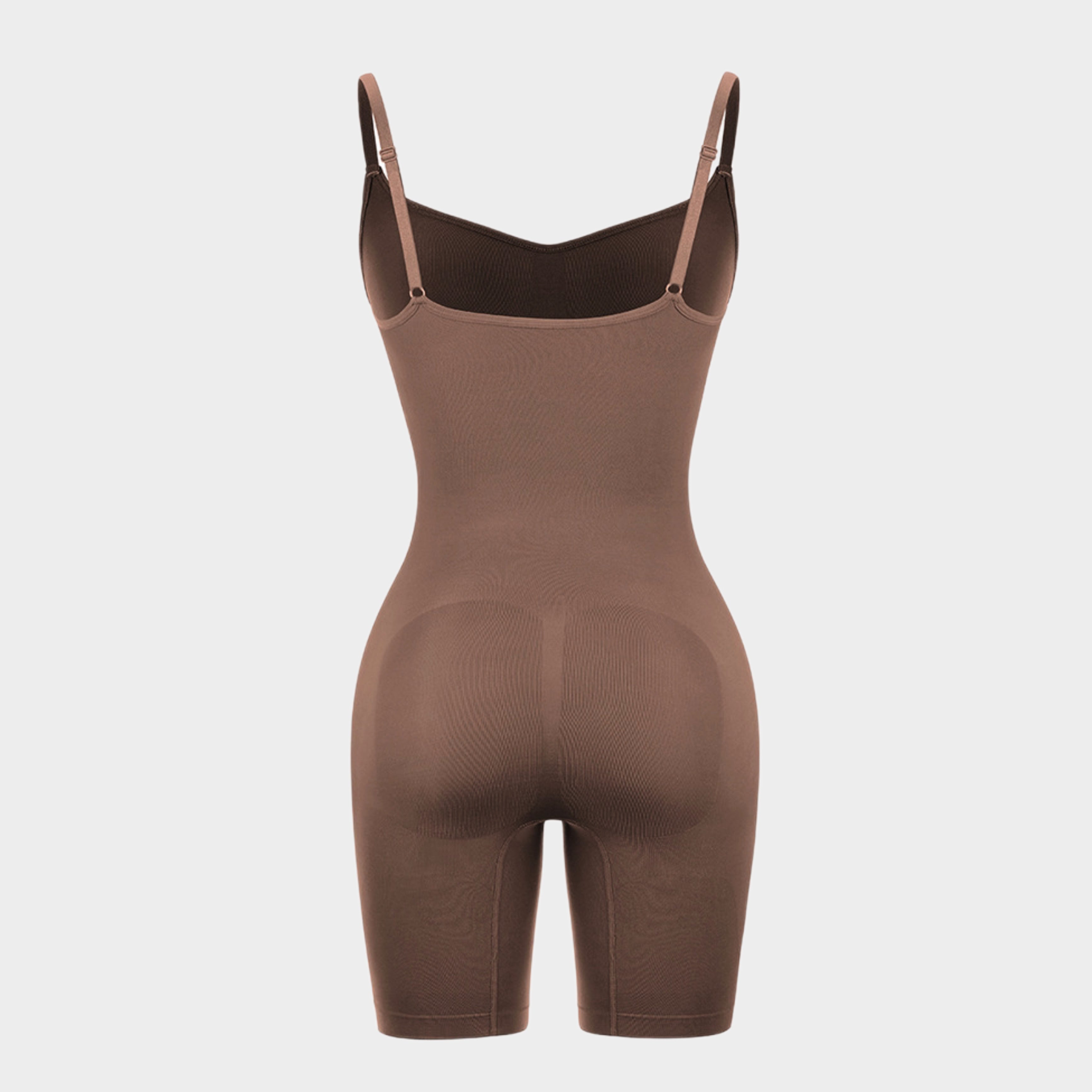 - Mid-thigh length offers extended coverage and thigh smoothing